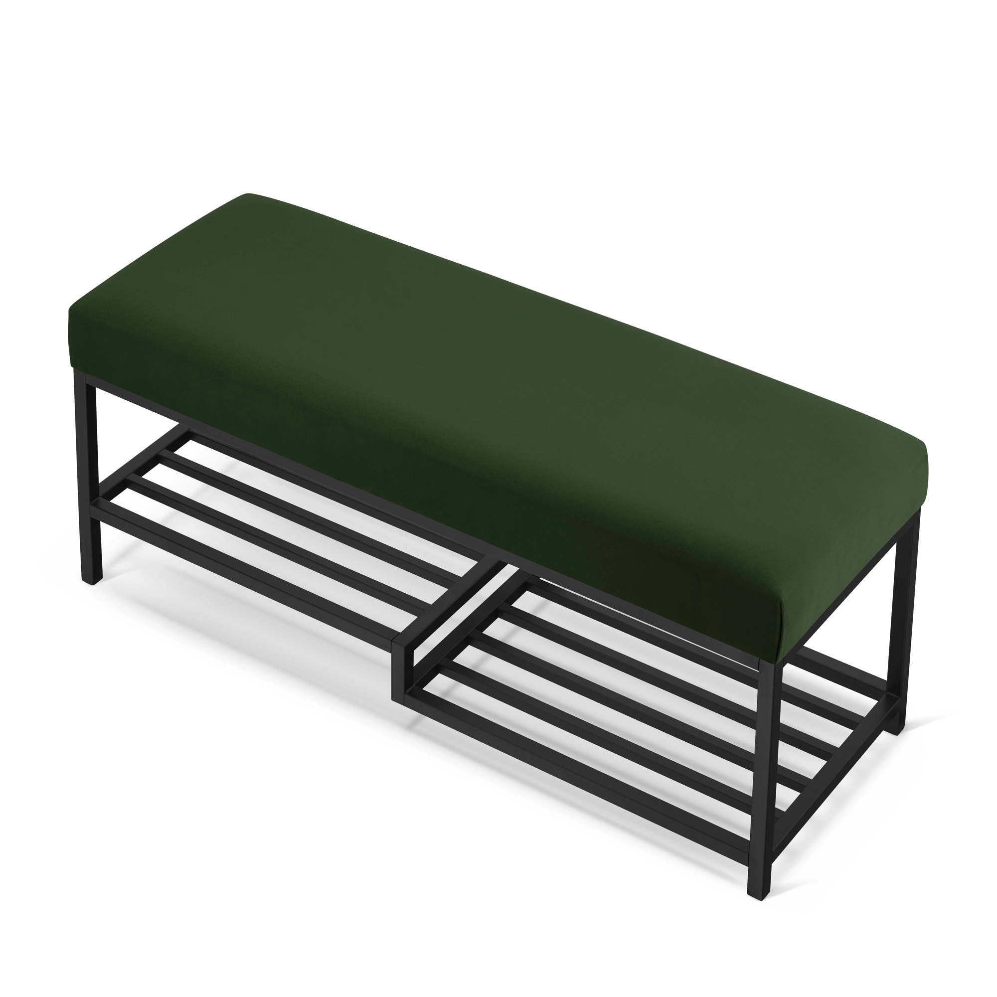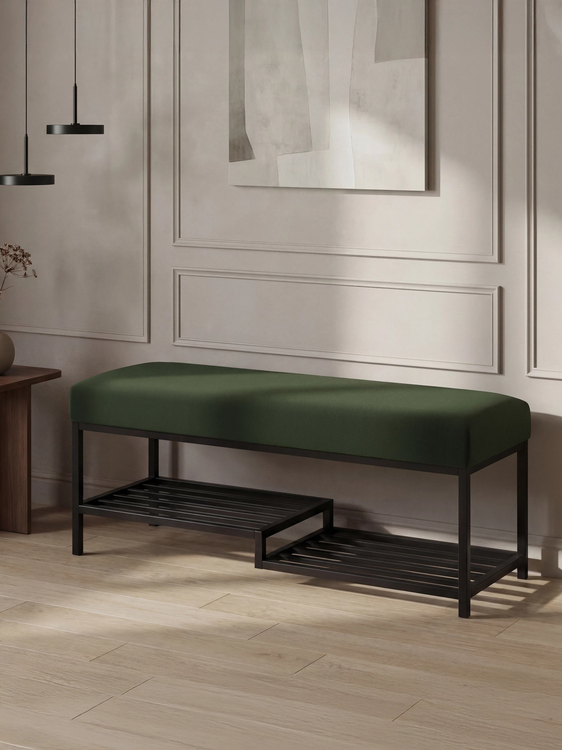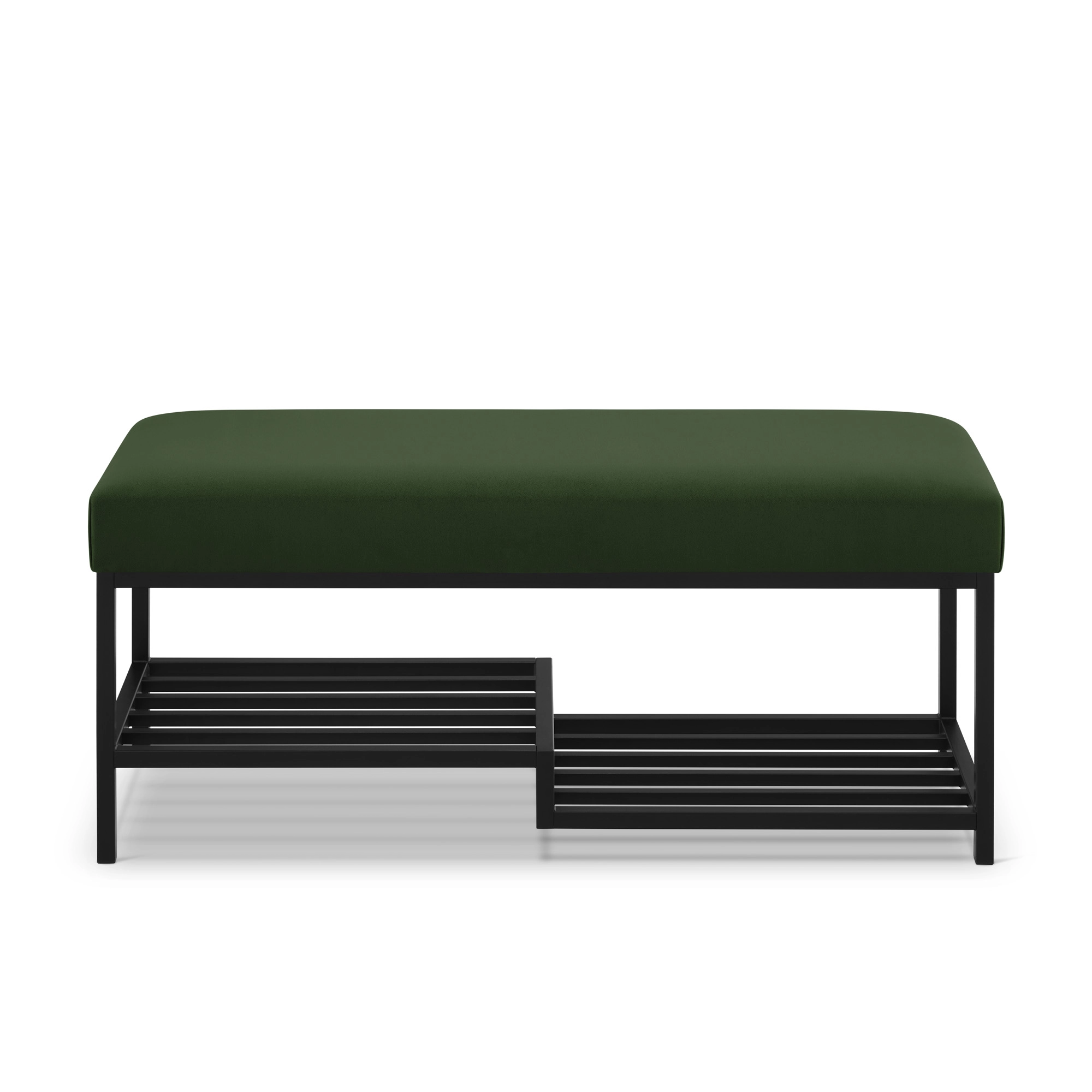 Un banc moderne doté d'une étagère asymétrique, alliant confort et fonctionnalité. L'assise rembourrée et moelleuse assure un confort optimal au quotidien. L'étagère pratique permet de ranger vos chaussures, et ses différents niveaux offrent un espace de rangement pratique pour les chaussures basses comme pour les bottes. Sa forme simple et sa structure en acier font de ce meuble un élément idéal pour l'entrée, la chambre à coucher ou le dressing. Ce banc moderne avec une étagère asymétrique facilite l'organisation de l'espace dans l'entrée.