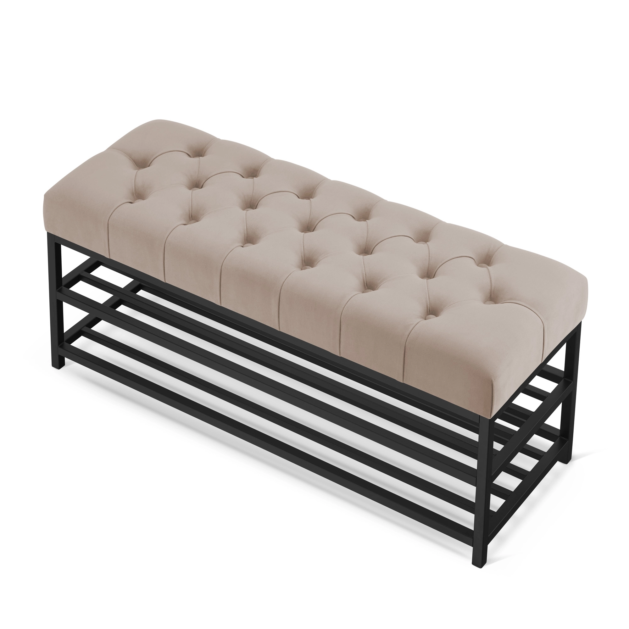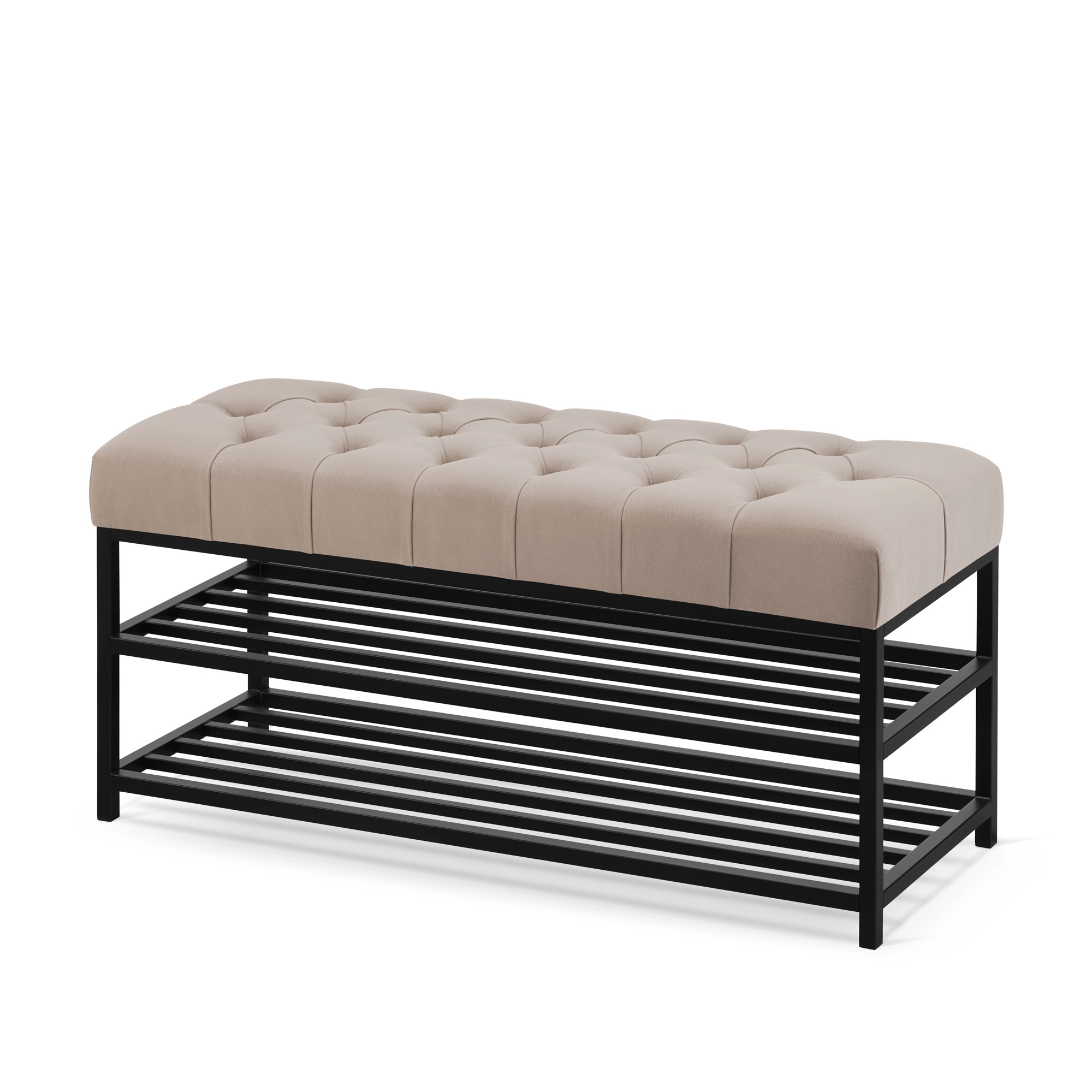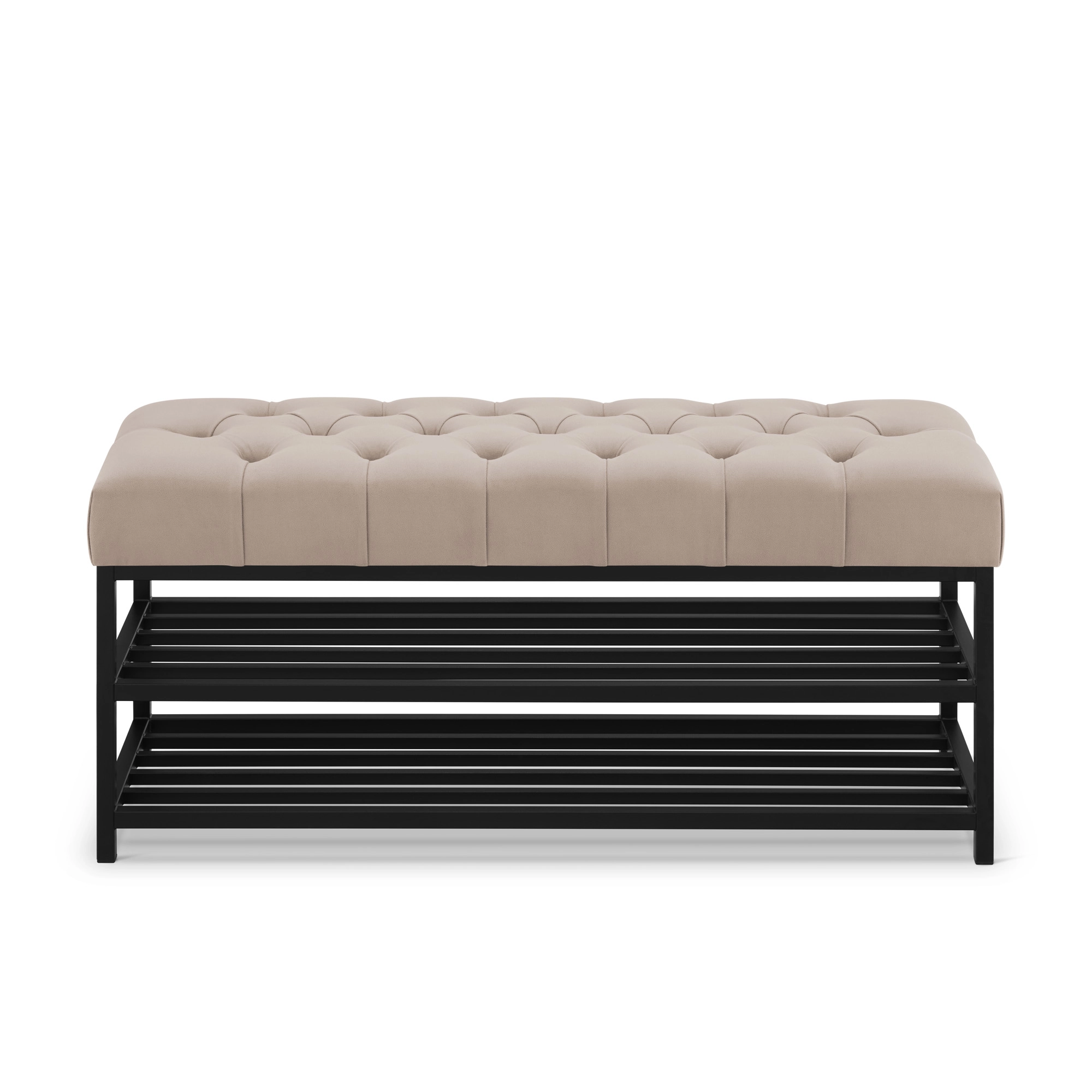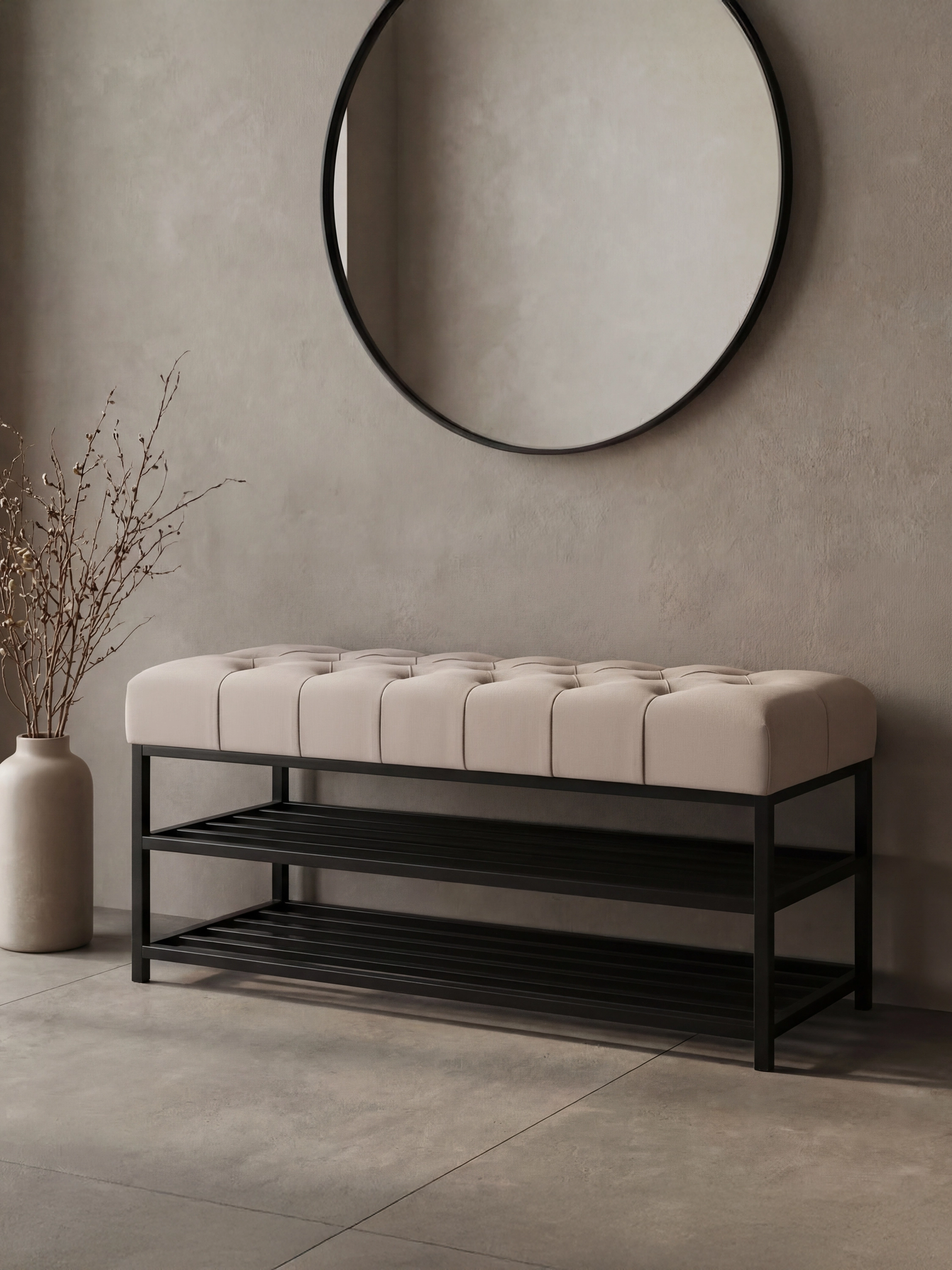 Un banc doté de deux étagères et d'un matelassage marqué qui lui confère un caractère plus élégant et raffiné. Les deux étagères permettent de ranger vos chaussures, tandis que l'assise moelleuse assure un confort au quotidien. Il trouvera sa place dans l'entrée, le dressing ou la chambre à coucher, s'adaptant à différents espaces.
