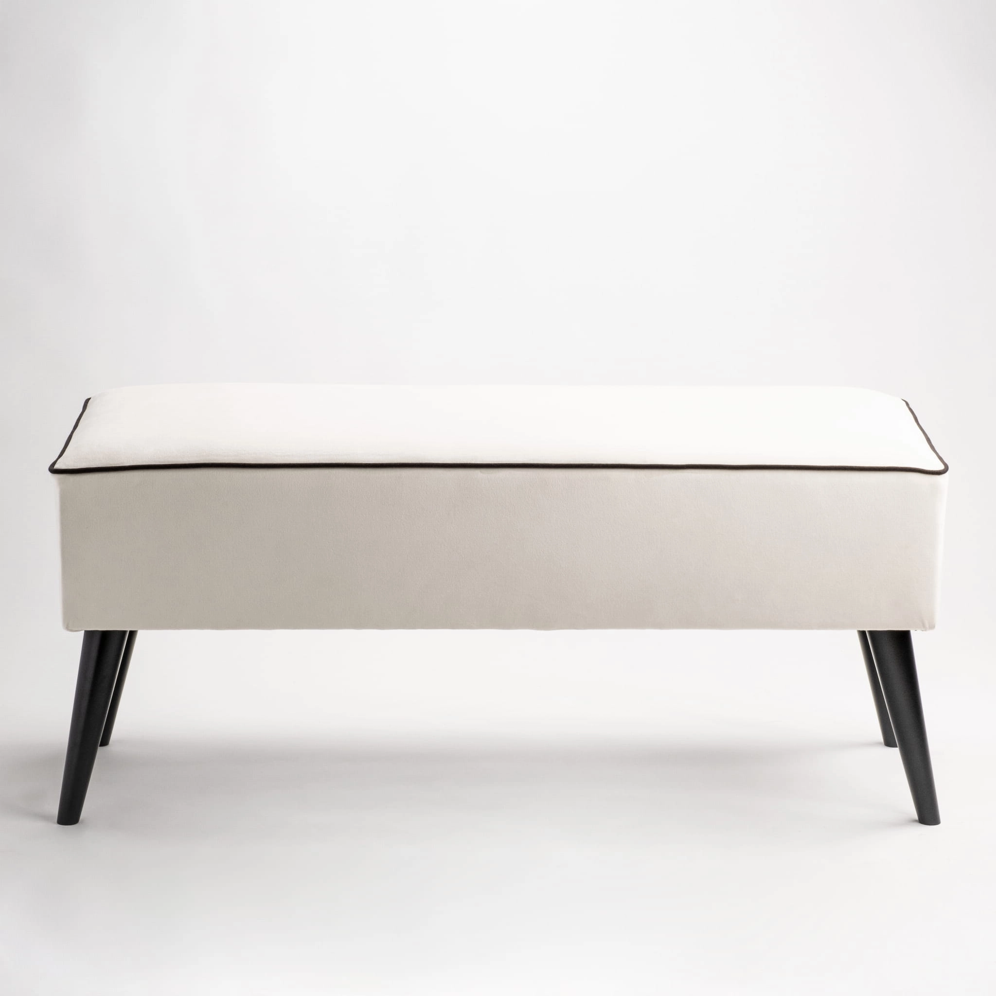 La perfection de la crème dans une découverte cubique. Banc d'entrée fait à la main dans les couleurs les plus vives que nous avons. Et nous en avons beaucoup. Car en fin de compte, c'est vous qui décidez de l'aspect final de banc. Les tissus que vous trouverez dans nos palettes sont résistants aux taches, à l'abrasion et à la lumière de soleil. Le siège est rempli de ouate hypoallergénique et de mousse de rembourrage épaisse, de sorte que vous pouvez vous asseoir royalement sur le banc. Vous pouvez choisir des pieds en bois ou en Metal dans notre gamme. Les premiers sont fabriqués en bois de hêtre de qualité A, tandis que les seconds sont en acier chromé. Ces deux matériaux garantissent la stabilité de banc. Vous pouvez également choisir parmi trois variantes de bordures : noir, blanc ou or.