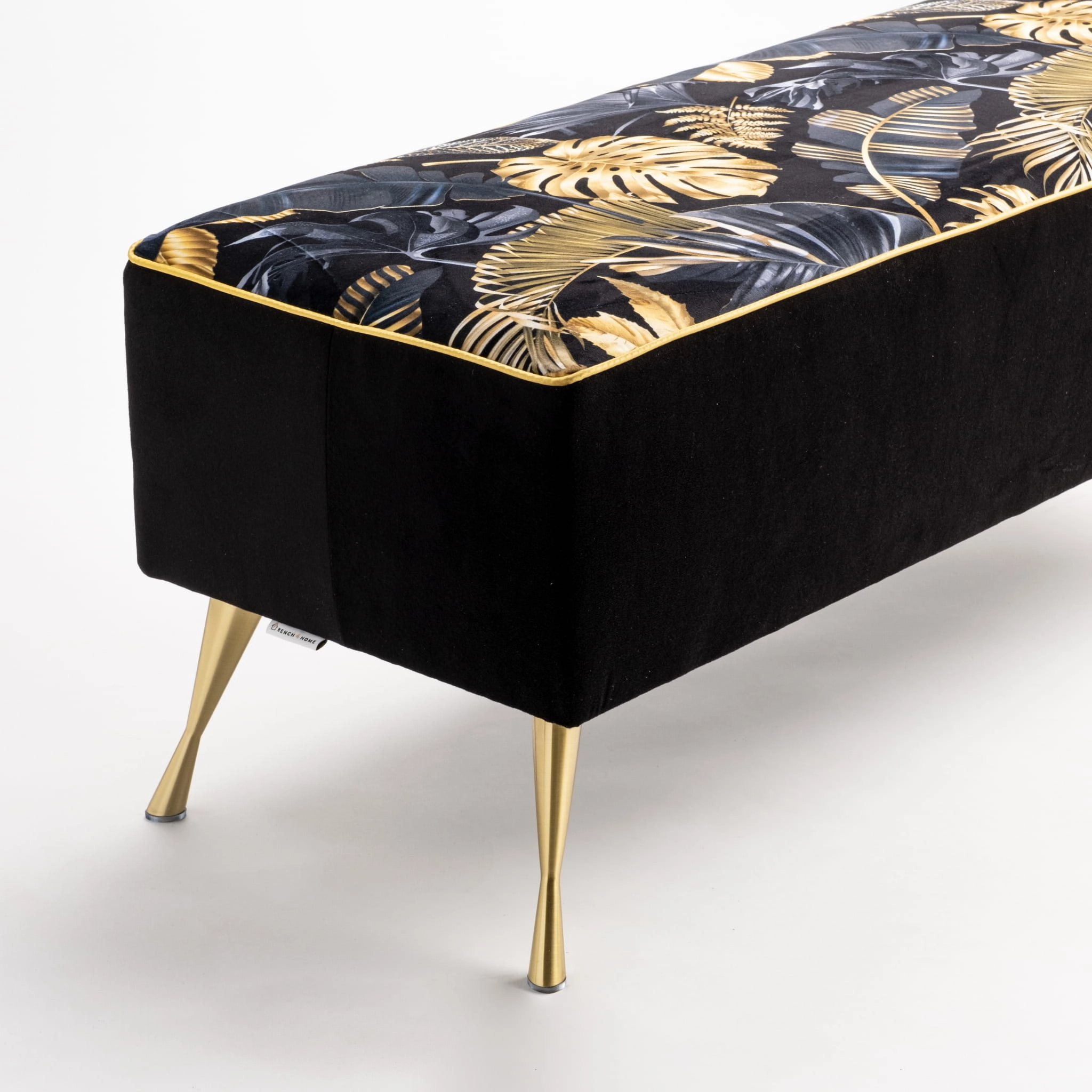 Banc exclusivement doré et luxueusement détaillé pour le couloir, la boutique ou la chambre. Un banc glamour fabriqué à partir des meilleurs composants. Pourquoi le meilleur ? Parce que nous le fabriquons à la main et que nos tissus sont très résistants à l'abrasion, aux taches, à l'absorption d'humidité et à la lumière de soleil. Vous décidez de tissu qui sera utilisé pour le siège et vous décidez des pieds que nous devons préparer pour vous. Et le choix est électrrrrrible. Les pieds en bois sont en hêtre de classe A, que nous façonnons, ponçons et enfin peignons au pistolet avec un vernis résistant aux éclats. Si vous préférez les pieds en Metal, vous avez le choix entre trois couleurs.