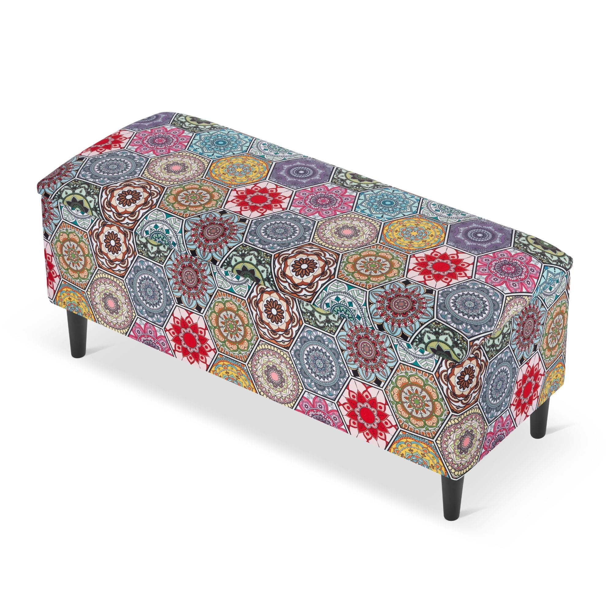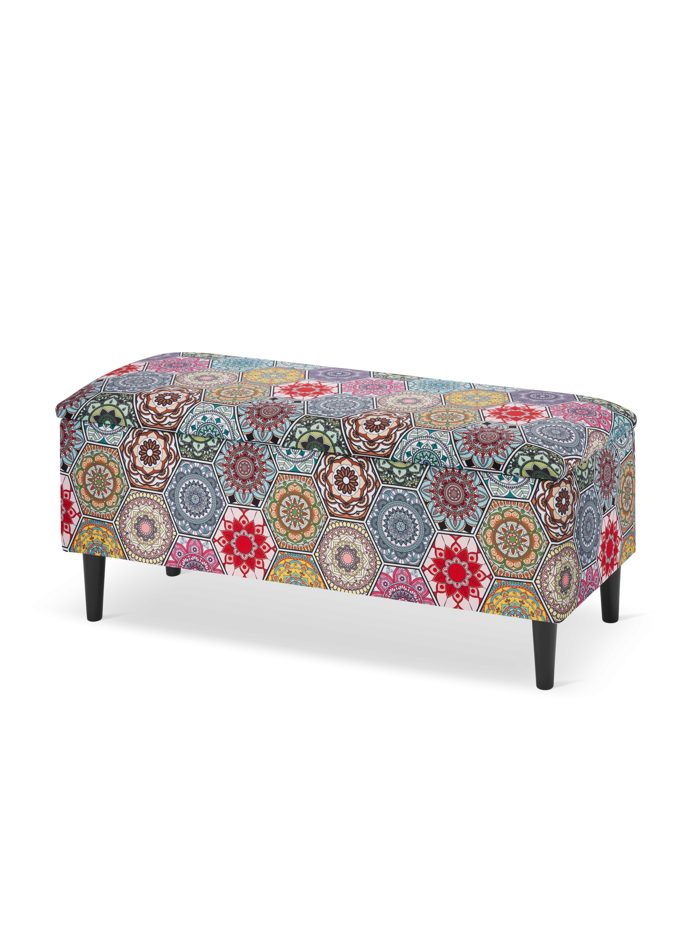 The oriental patterns of the upholstery give the ottoman a unique character and exotic charm, creating an atmosphere of mystery and adding a touch of exoticism or boho style to the interior. In addition to its aesthetics, the storage ottoman offers numerous practical advantages. With the storage compartment inside, you can store various items such as blankets, pillows, magazines, or toys.