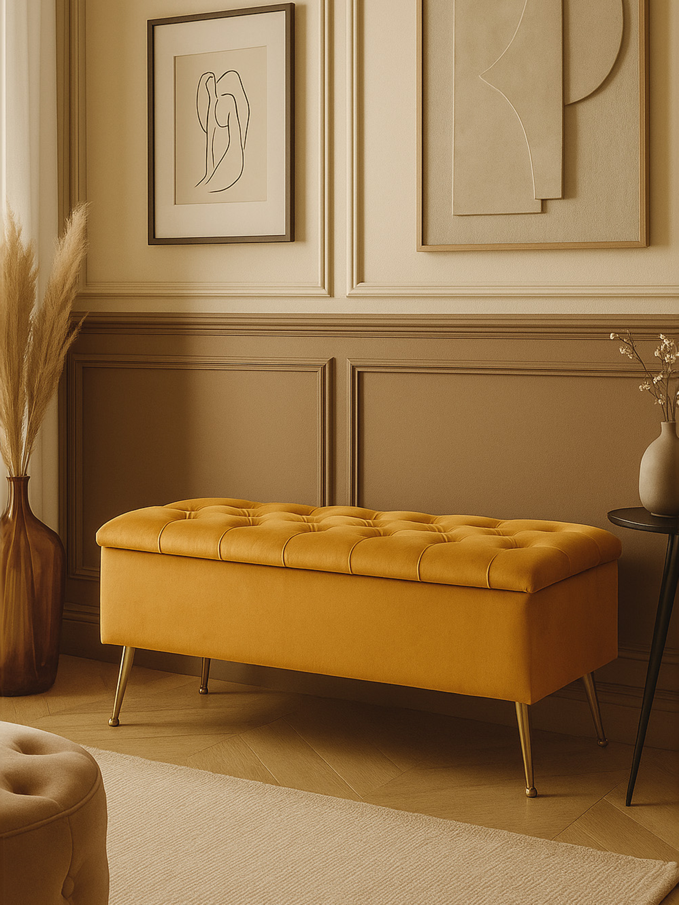 Orange et rouge, la couleur de l'exotisme délicieux. Le tissu Papaya, avec lequel le coffre est tapissé, est à la fois rafraîchissant et éclairant. Ce matériau, comme tous ceux de notre boutique, est certifié Oeko-Tex et résiste aux taches et à l'abrasion. Le banc est entièrement fabriqué à la main. Entre autres, le siège, qui est rempli de mousse de rembourrage et de ouate hypoallergénique, s'ouvre grâce à des charnières à ressort silencieuses. Le coffre est rembourré avec de l'éponge et l'ensemble repose sur des pieds de votre choix. Fabriqué en bois de hêtre de qualité A ou en acier chromé en deux couleurs.