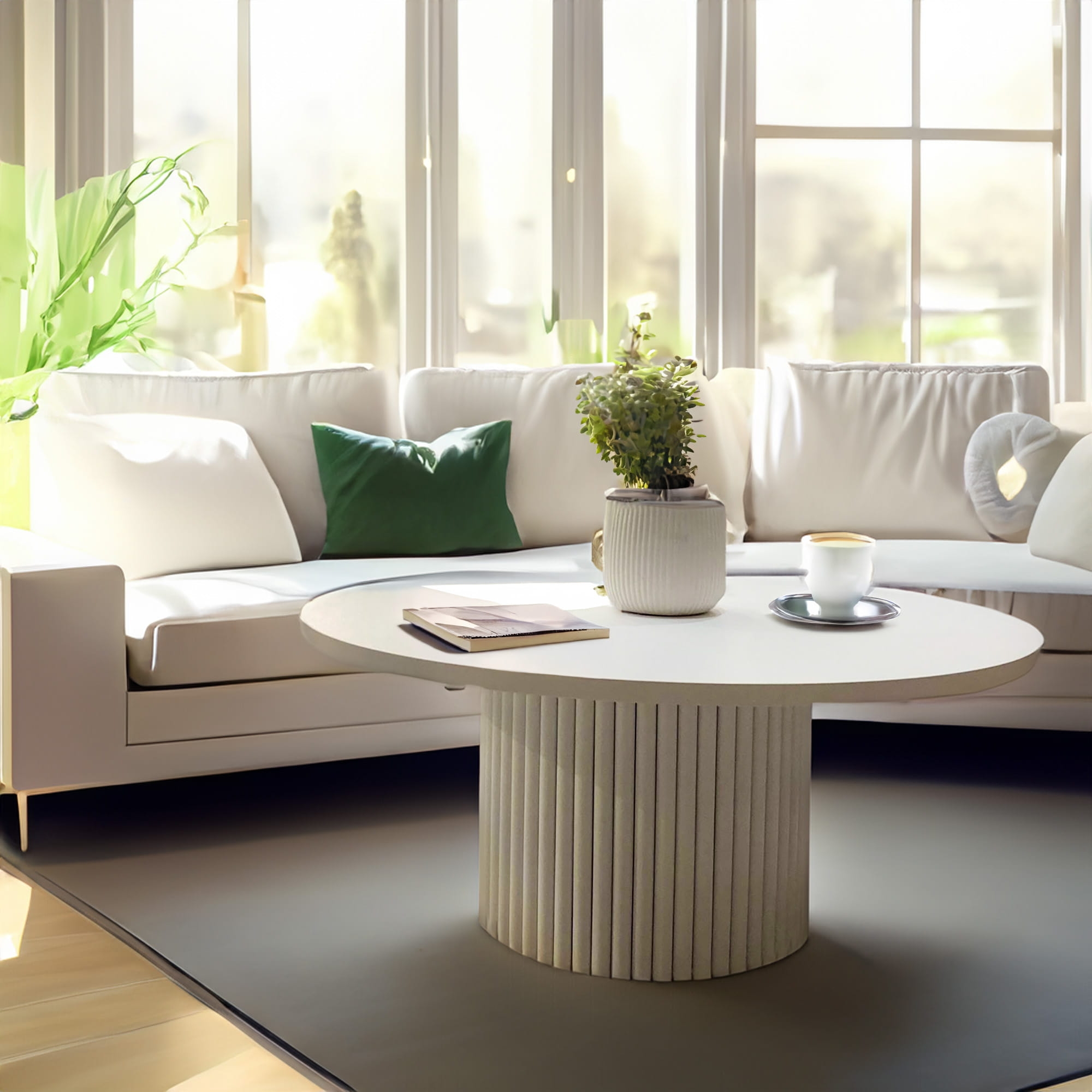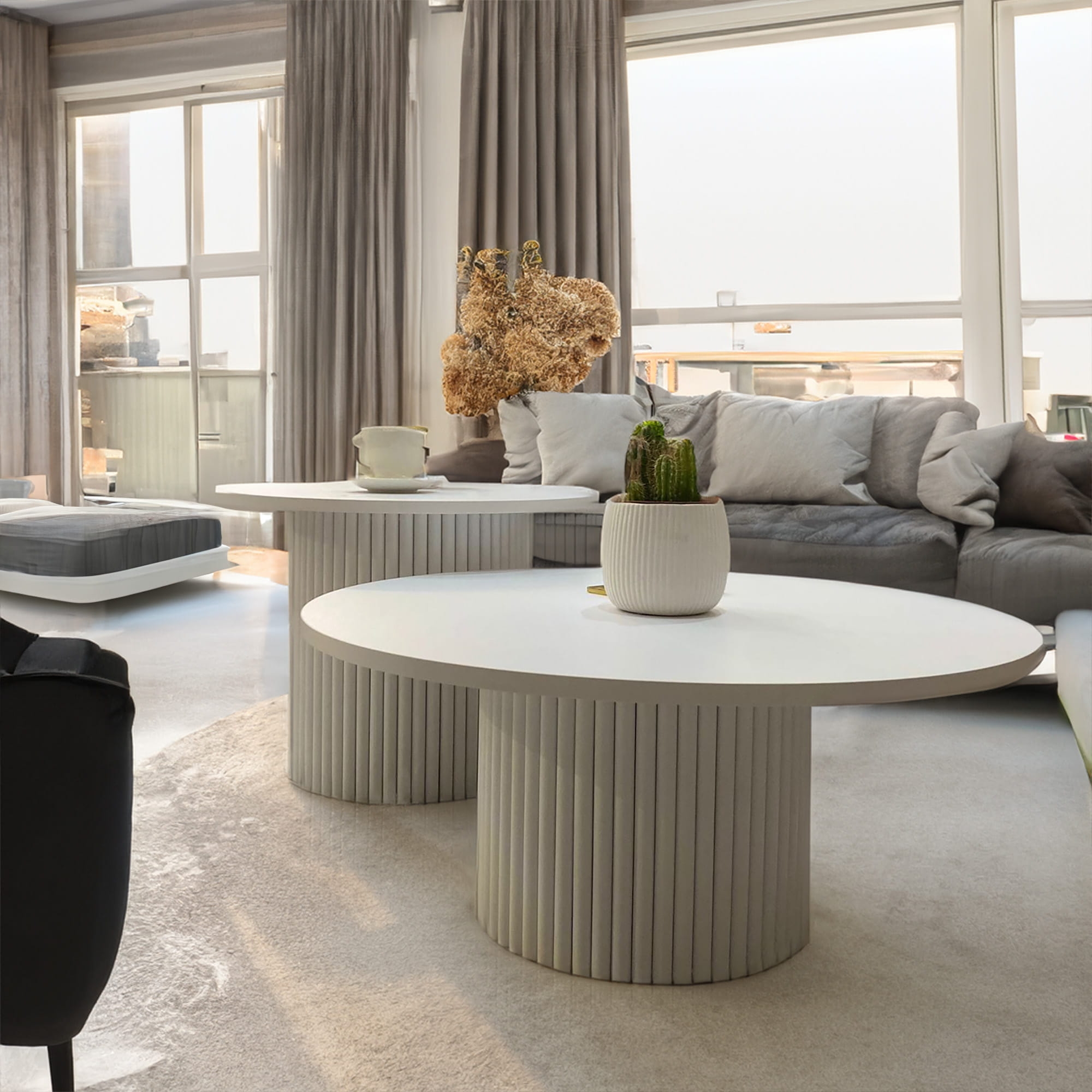 Des tables basses uniques avec un plateau rond et une base cannelée, disponibles en différentes tailles et couleurs, peuvent parfaitement compléter l'aménagement d'un salon, d'une chambre à coucher ou même d'une salle de bains. Elles rempliront à la fois la fonction de tables d'appoint pratiques et de tables d'appoint.